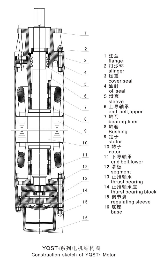注:用户订货时,如有特殊要求,请于制造商协商。适用条件 1、电动机应完全潜入水中立式(或卧式适用),其潜入深度不大于70m,但不小于20m,最底位置距井底不少于5m(卧式使用时水位应高于潜水电机1m以上)。 2、介质水温不高于25℃。 3、水中固体杂质含量(重量比)不超过0.01%。 4、介质水中不含腐蚀性物质,PH值在6.5-8.5范围内。 5、电机运行时内部应充满洁净的清水(可加防冻液)。 设备特点 电机防护等级:IPX8 充水式潜水电动机结构简单,定转子绕组和铁心直接浸在水中,冷却效果好、输出功率大、效率较高 由于充水式潜水电动机内腔所充多为清水,使用过程中产生的渗漏对所安装使用井水水质不会产生污染。 电动机运行性能稳定噪音极小 用户需要时可以卧式使用(但寿命是立式的60%)