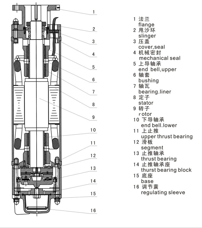 1、 潜水电机由定子、转子、上下导轴承、下连接法兰、底座、轴伸密封装置等组成。