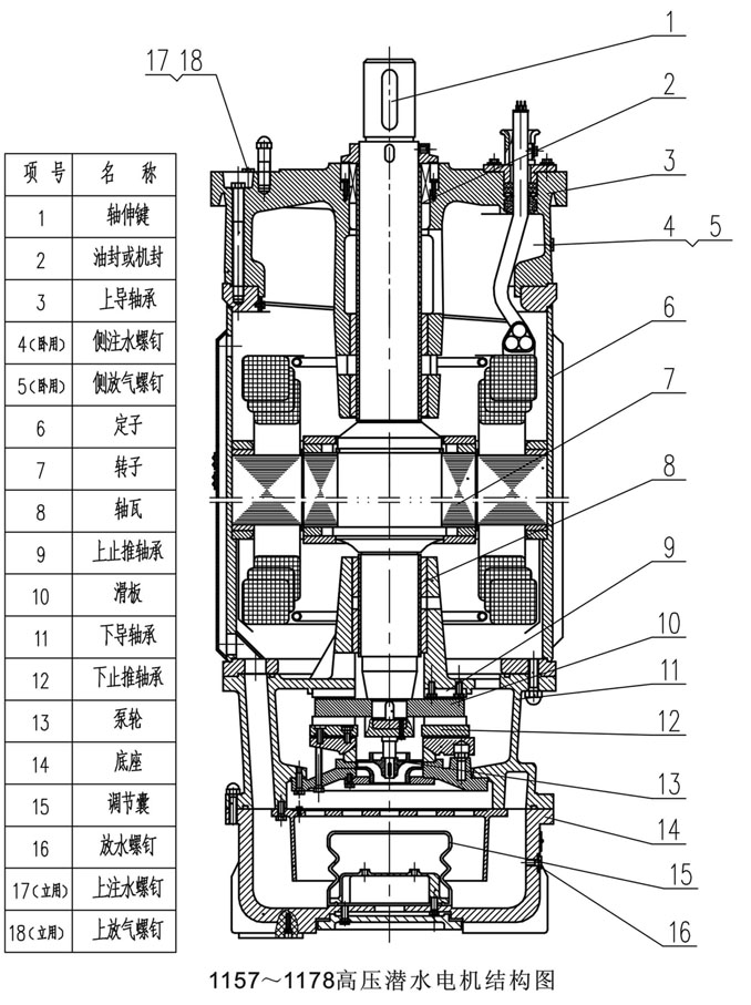 1、 潜水电机由定子、转子、上下导轴承、下连接法兰、底座、轴伸密封装置等组成。