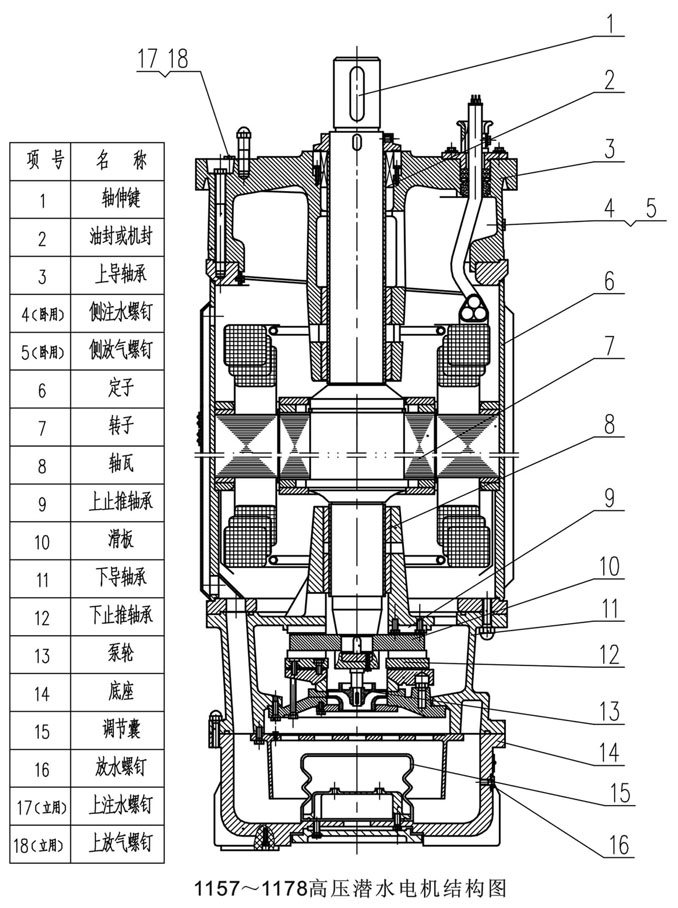 1、 潜水电机由定子、转子、上下导轴承、下连接法兰、底座、轴伸密封装置等组成。